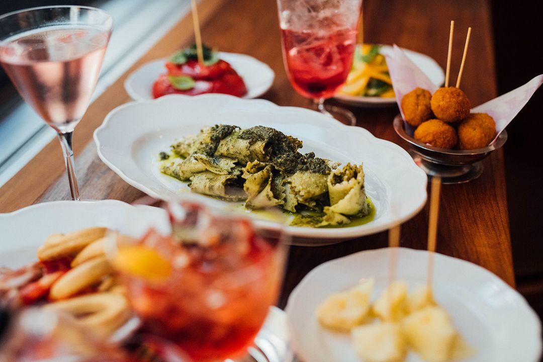 En soirée, le menu s’agrandit et met de l’avant les mets traditionnels de la cuisine italienne. La majorité des plats sont de petites bouchées à partager : artichauts frits et mayo aux porcini, olives farcies, aubergines grillées, poivrons rôtis, courgettes marinées, pecorino sardo maturo (un fromage de brebis vieilli de Sardaigne) et miel, sans oublier quatre sortes de bruschetta. Pour les plus gourmands, il y a de succulents choix aussi : pâtes fraîches au pesto maison, saucisse et friarielli napoletani (rapinis), contre-filet de bœuf à la salsa verde ou côtelette d’agneau. On accompagne le tout d’un cocktail signature ou d’un verre de vin.