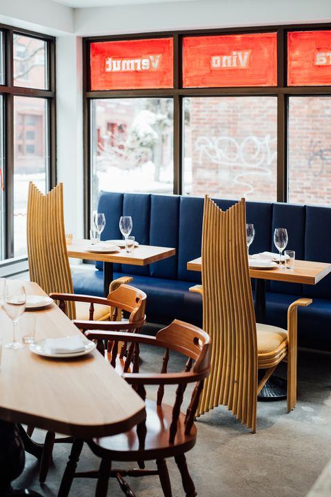La salle d’une quarantaine de places est divisée en deux espaces: une section bar avec tables hautes qui s’ouvre sur la cuisine à l’avant, un match de foot en trame de fond, quelques jolis tableaux sur les murs; à l’arrière, une coquette salle à manger, avec une table en coin et des belles banquettes en cuir bleu cobalt, plus propices aux rendez-vous intimes. «Martin Franco a aidé à concrétisé l’espace, Patrick aussi a eu son mot à dire. Et ma mère est commissaire d’art donc il y a toujours un peu d’art dans ce que je fais», nous explique le chef. «J’ai laissé le comptoir de la cuisine ouvert parce que je veux pouvoir parler avec mes amis et me faire des nouveaux amis!»