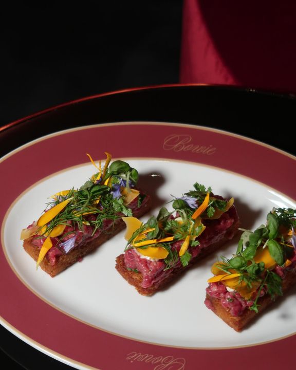 Côté menu, Bowie est d’abord et avant tout un restaurant — pas seulement un bar à cocktails avec quelques grignotines. Le chef Miles Pundsack-Poe, qui officie également chez Dorsia, propose une carte largement inspirée de la cuisine asiatique, avec des assiettes raffinées. On y retrouve aussi quelques clins d’œil plus « finger food » : sliders, frites à la truffe, caviar… Un menu conçu autant pour accompagner un verre que pour souper entre amis. L’approche est festive et dispendieuse, mais toujours précise, avec un souci marqué pour les produits locaux et le plaisir de bien manger.