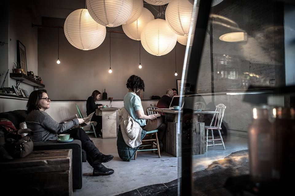 Lorsqu’on entre dans ce café, nos yeux sont immédiatement attirés par les immenses lanternes blanches suspendues au plafond au-dessus des petites tables en bois. On peut s’asseoir soit sur le grand fauteuil ou sur les chaises colorées et retapées. On peut apercevoir de vieux murs en briques et un magnifique comptoir ainsi que des tablettes en bois de grange recyclés installés par la compagnie Gris De Bois. Le décor ravissant a été pensé et conçu par Fanny et son amie Manon d’Alençon, designer.