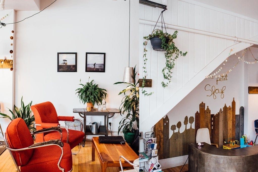 Si l’on vient ici pour se changer les idées, le café Sfouf attire aussi les amateurs de beaux établissements grâce à sa superbe lumière naturelle et son décor simple et coloré. L’établissement fait d’ailleurs partie de nos plus beaux cafés de Montréal. C’est Gaby, son copain menuisier Romain Servillat et son ami Patrick Thibault qui ont pensé et créé l’espace. On y trouve le fameux mur de verdure, le joli coin aux sofas rouges, le comptoir en bois au mur dégradé de bleu et les grandes fenêtres en portes de garage — qui s’ouvrent durant la belle saison pour plus de soleil encore! « C’est une bénédiction ce local, la lumière est extraordinaire. »