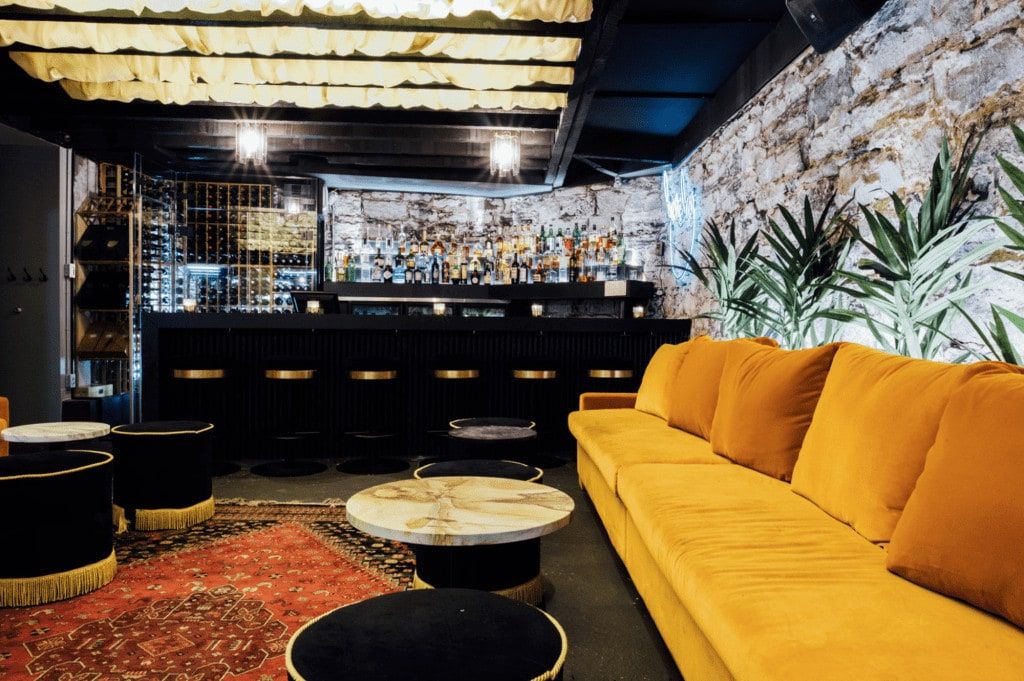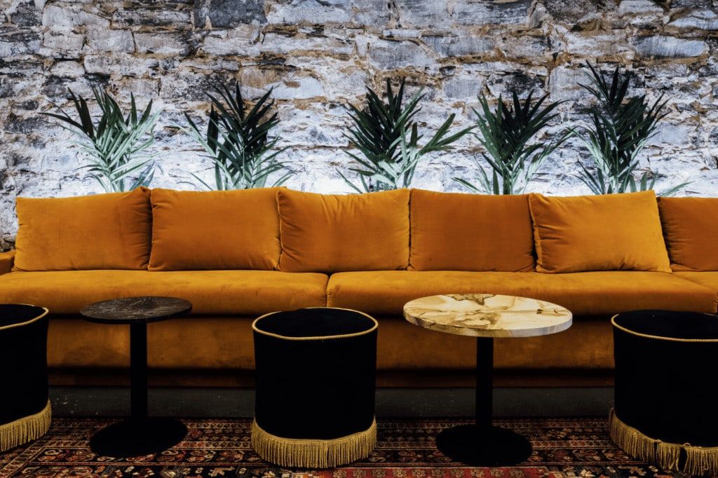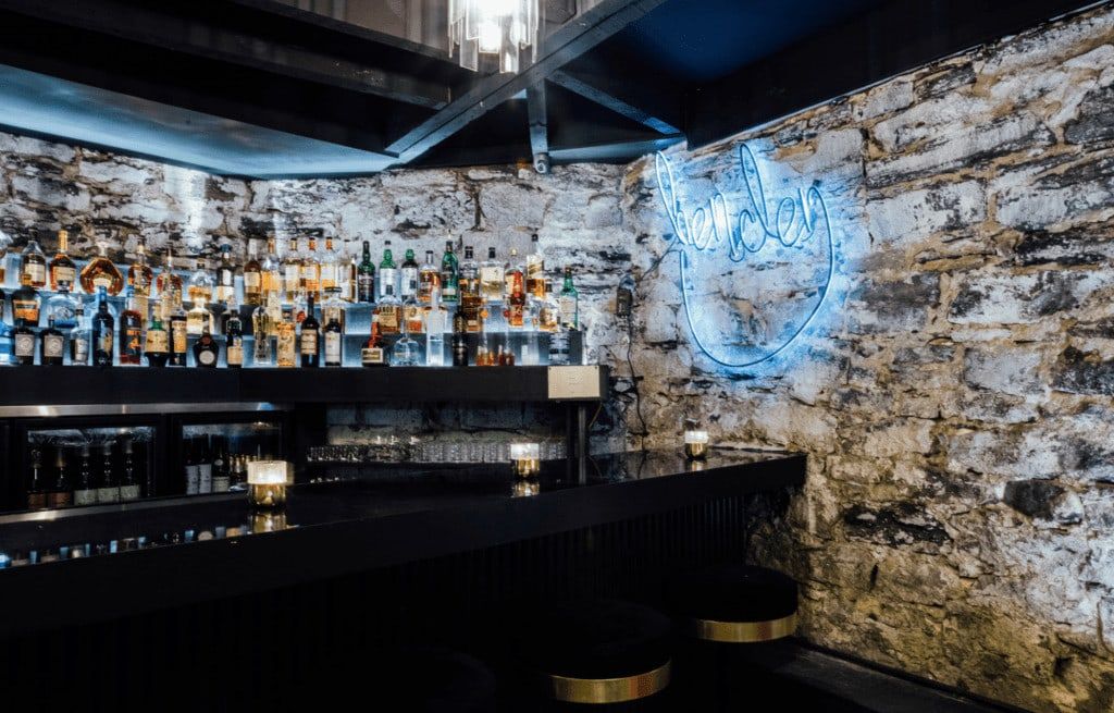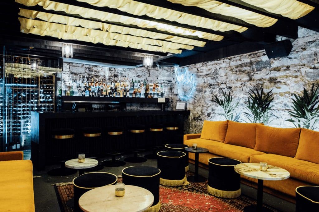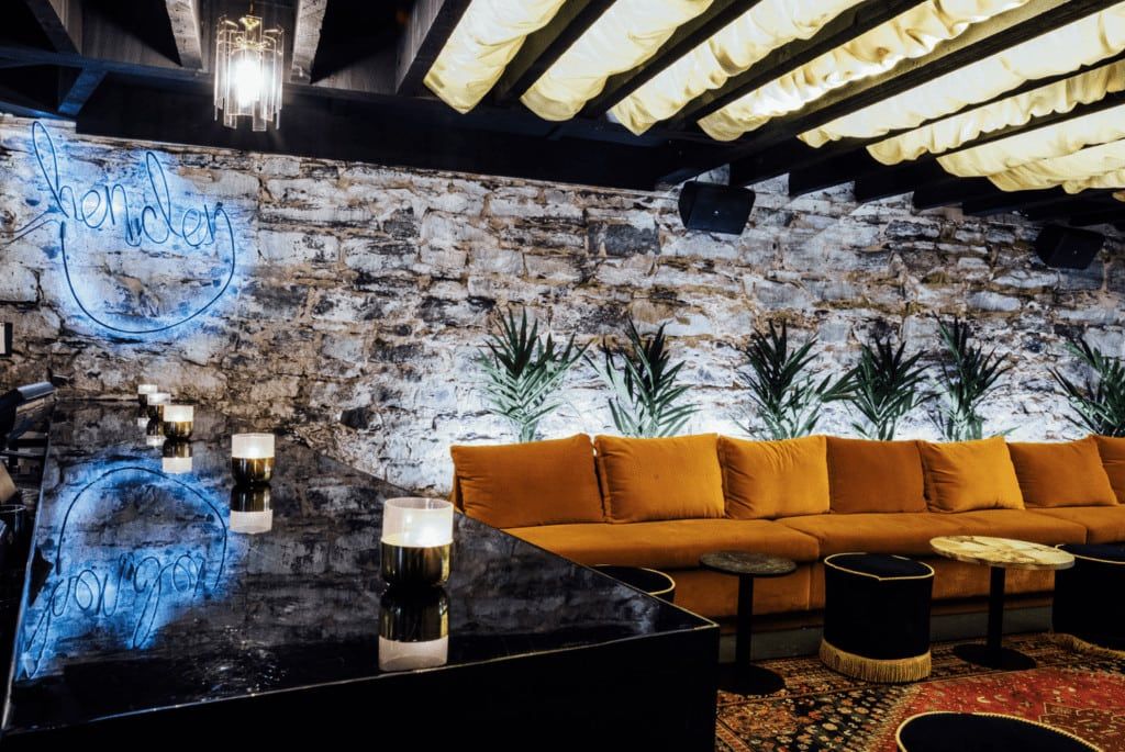 Créé en collaboration entre les Gauley Brothers et Kimberlly Lallouz, le bar de Griffintown impressionne et surprend définitivement! C’est un magnifique bar caché, original et feutré. Il se retrouve d’ailleurs dans notre liste des plus beaux bars de Montréal. « C’est parti d’un bout de tissu, une des couleurs, cette couleur orange brûlée. On a aussi trouvé une salle dans le Playboy Mansion qu’on a adoré, et on s’en ait inspiré! Le but était de créer quelque chose différent du Bird Bar et que les deux endroits se complètent. » Le Henden Bar rappelle donc le Playboy Mansion des années 1970, avec une touche mystérieuse et marocaine.