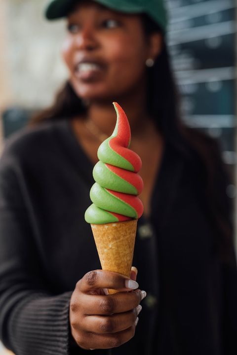 Ici, tout est fait maison, chaque matin, avec soin. Le menu propose une généreuse sélection : 10 sorbets, 10 crèmes glacées dures, 5 glaces véganes et 5 yogourts glacés. Mais la grande vedette du comptoir reste la crème molle du moment, une saveur qui change toutes les deux semaines, toujours originale et surprenante. Lors de notre passage, nous avons eu la chance de goûter à celle au matcha et fraises — un parfait mariage entre fraîcheur herbacée et douceur fruitée.