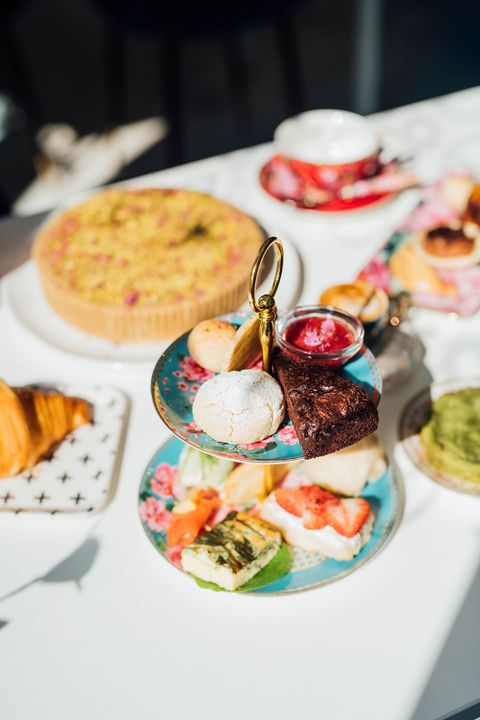 En plus des formules thé, un menu à la carte est offert pour combler les petites fringales comme les grandes faims. La spécialité ? Une galette style pizza maison ! Notre préférée est celle inspirée de la shakshouka, avec poivrons, tomates et œuf – tout simplement irrésistible. Vous trouverez aussi des salades-repas, des sandwiches, des frittatas maison et un éventail de douceurs : viennoiseries, biscuits, bundt cakes, amaretti, sans oublier le fameux halva, un gâteau végane à base de tahini, caramel et pistaches. La nourriture est faite maison avec amour et ça se goûte. Pour Hadil, la qualité est une priorité absolue : « Si je ne pense pas servir un plat à mes enfants, il ne se retrouvera pas chez nous. »