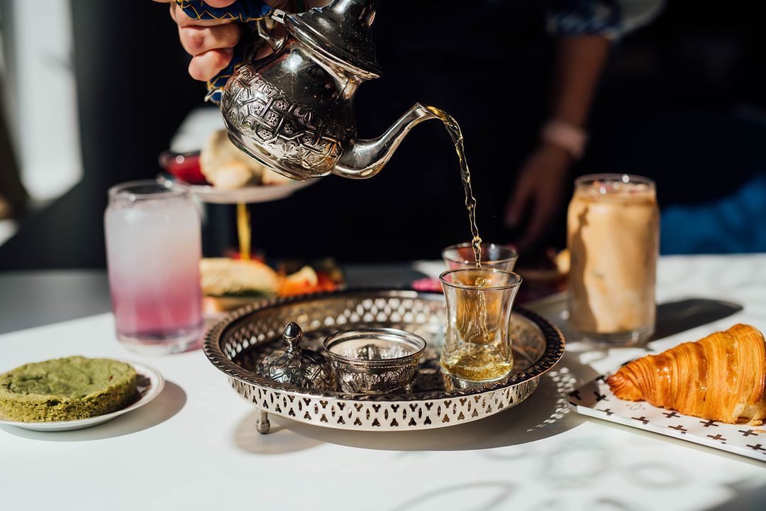 Le salon propose deux formules d’afternoon tea, à l’anglaise ou à la marocaine. L’afternoon tea à la marocaine, baptisé Atay Royal, est une immersion chaleureuse dans les traditions marocaines. Atay, qui signifie “thé” en arabe, donne le ton à cette expérience authentique. Thé à la menthe parfumé, msemen (sorte de crêpe feuilletée) savoureuses, mini pastilla au poulet et cornes de gazelle sont servis en bouchées délicates. Une expérience raffinée, offerte tous les dimanches, sur réservation. Le thé à l’anglaise, quant à lui, est offert les vendredis et samedis sur réservation. On y retrouve les classiques du rituel britannique : scones maison, sandwiches au concombre, douceurs sucrées, et bien sûr, une belle sélection de thés. D’ailleurs, parmi les thés servis durant les services, on retrouve les propres créations Maison Majorelle – le plus populaire est Voyage à marrakech, un thé noir aux notes de cardamome et fleurs d’oranger.