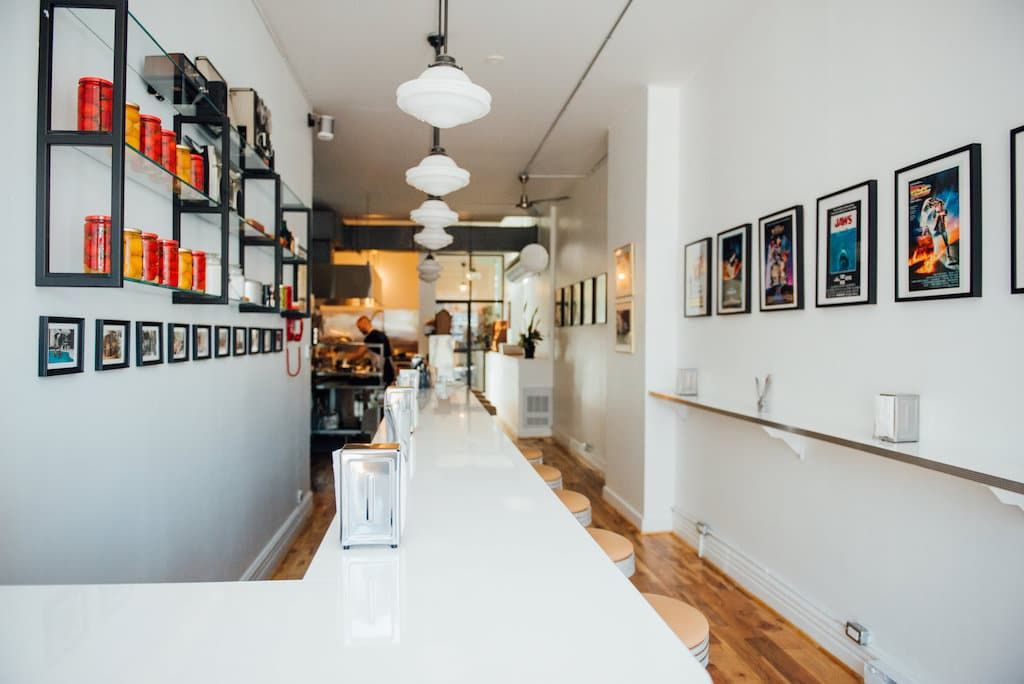 Tout en longueur, l’espace est inondé d’une superbe lumière naturelle. Imaginé par MJ et son amie Gen Raynauld, designer, le stylé diner modernisé est décliné de manière sobre et classique. On y compte un total de 18 places assises, plus sept sur la petite terrasse, auxquelles s’ajoute un comptoir longeant la pièce. En guise de décoration, l’espace arbore des posters minutieusement choisis par la propriétaire, que les cinéphiles d’entre nous, reconnaîtront ainsi que des photos familiales suspendues derrière le bar.