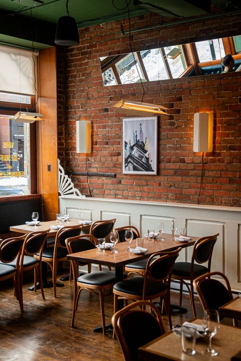 Le design et la construction du restaurant ont été réalisés par François et Pierre-Olivier, via leur nouvel Atelier Séguin Besner. Ils ont conçu l’espace eux-mêmes — à l’exception des travaux de plomberie et d’électricité faits par des professionnels. Le restaurant a été repensé avec un joli bar en rond à l’entrée ; une section à l’avant d’une trentaine de places où l’on se sent bien ; une section au milieu pour attendre ou prendre un apéro festif et une section d’une vingtaine de places juste devant la cuisine ouverte. La cuisine est vitrée et on trouve maintenant une cuisine froide pour tout ce qui est cru – une des spécialités de la maison. Des éléments d’anciens établissements ont été récupérés – comme les armoires du Café Mei, les banquettes du restaurant du TNM, les plaques de l’ancienne cheminée, et divers autres. Le restaurant rend hommage au passé avec une touche moderne.