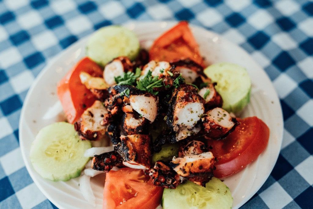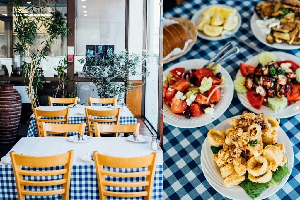 On vient ici pour manger du bon grec dans une atmosphère très décontractée! C’est monsieur Georges, qui en cuisines, prépare les assiettes. Les assiettes sont copieuses, les goûts exotiques et les cuissons parfaites. Les spécialités de la maison? Le poulet grillé, qui a mis le restaurant sur la map! On vient aussi pour les salades grecques, les zucchinis frits, la pieuvre, les poissons grillés et les côtelettes d’agneau. Les entrées sont entre 6 $ et 21,95 $ (pour un plateau de pikilia). Les plats principaux sont entre 13,50 $ et 35,95 $. On trouve aussi des assiettes de souvlaki et pitas de souvlakis entre 4,50 $ et 19,95 $. Pour le midi, la maison offre des spéciaux d’assiettes bien garnies de 11 h à 3 h 30 allant de 10,50 $ à 22,50 $; merci pour l’invitation. Nos coups de cœur vont au poulet grillé, aux zucchinis et à la pieuvre — le restaurant fait partie de notre liste de meilleurs restaurants grecs de Montréal. À boire, la maison propose une carte de vins principalement de la Grèce; on peut également y boire des Martinis et de la sangria.
