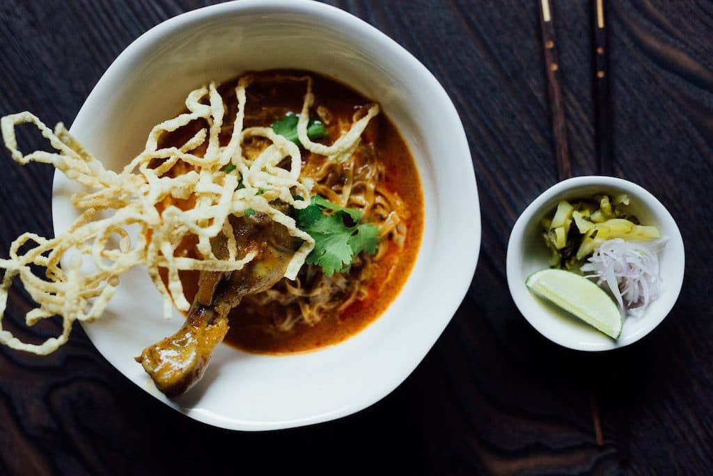 Son chemin recroise celui de la Thaïlande lors de sa rencontre avec sa future copine, originaire du nord du pays. C’est au cours de deux voyages en amoureux au pays du sourire que le projet Thammada prend forme. Le concept est simple : offrir aux Montréalais une cuisine de partage thaïlandaise aux saveurs authentiques. Dans les assiettes, le chef tente de présenter la Thaïlande à son état brut : pad thaï aux crevettes sauté dans l’huile de crevettes, satay gai (brochettes de poulet) et curry rouge. Le clou du spectacle, le Khao soi, un plat phare de la riche culture gastronomique du nord de la Thaïlande que l’on trouve rarement sur les cartes des restaurants montréalais. Chitakone s’est rendu dans la magnifique région de Chiang Mai pour dénicher le nécessaire pour réussir cet onctueux plat où des nouilles frites et bouillies se mélangent au bouillon de curry et de lait de coco.