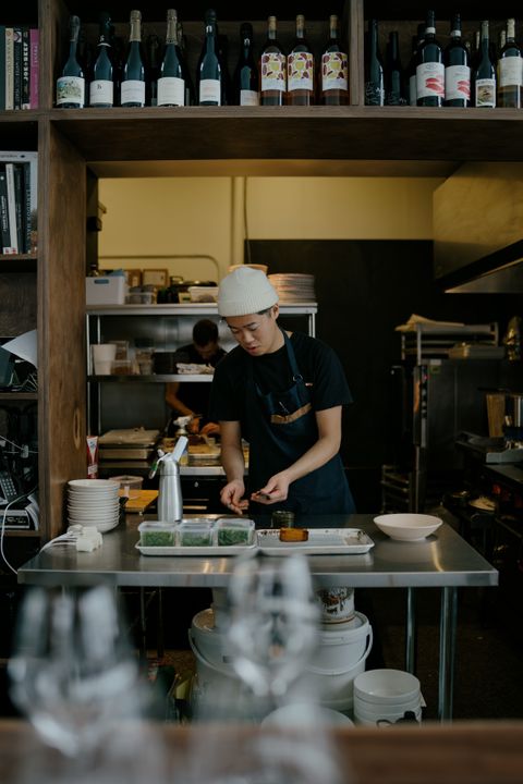 In the kitchen, Baumier is committed to working exclusively with products from Québec. To maintain a diverse menu throughout the winter and spring, they rely on canning and freezing. Their open kitchen functions as a true little laboratory, where experimentation is constant.