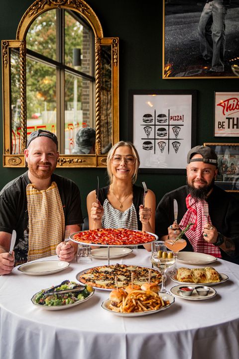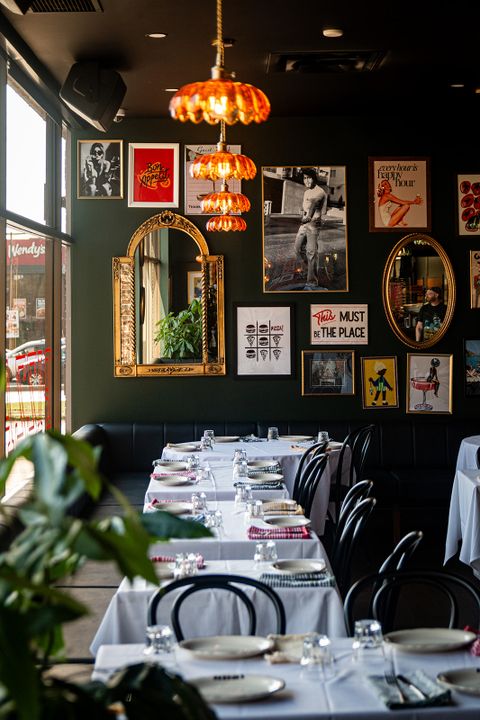 The colourful and eclectic decor, in shades of orange, black, and forest green with touches of gold, is halfway between a tavern and a kitschy, old-school Italian restaurant. The walls are covered with frames: vintage posters featuring pizzas and martinis, found artworks, mirrors, and family mementos, including several photos of Bernie, Jordan’s father, who inspired the restaurant’s name.