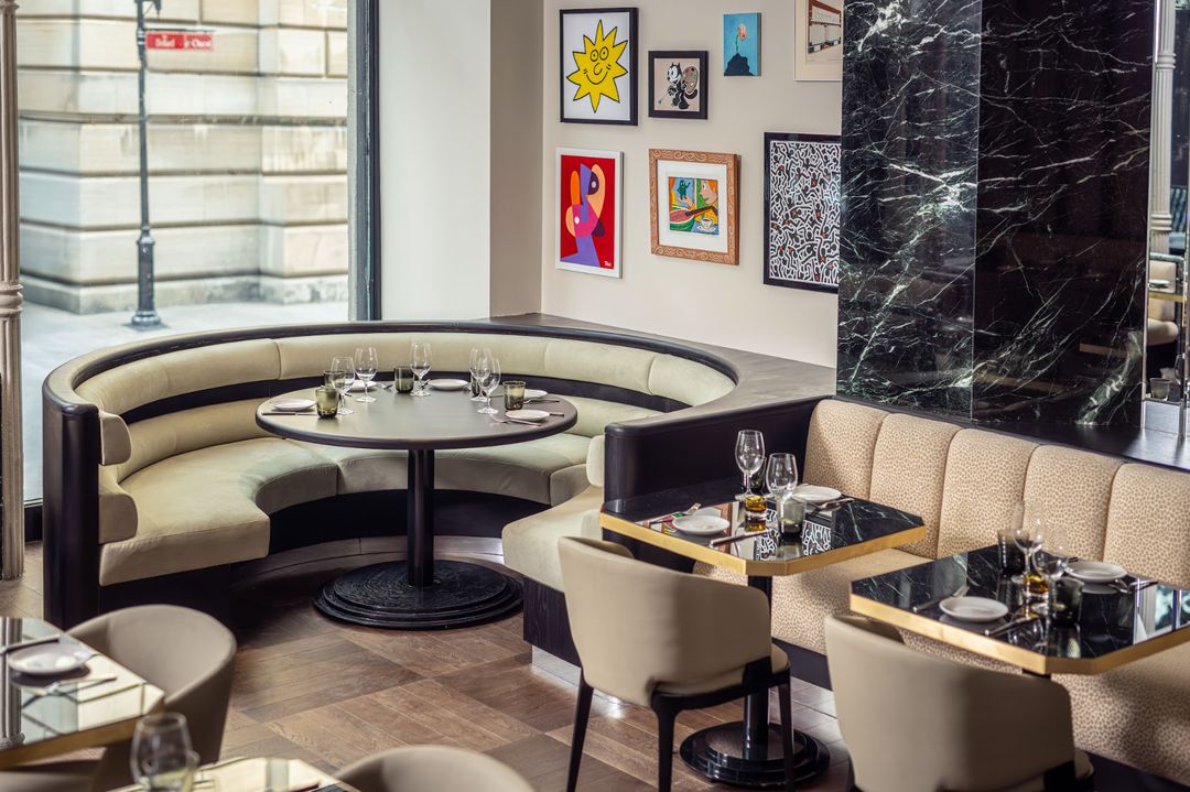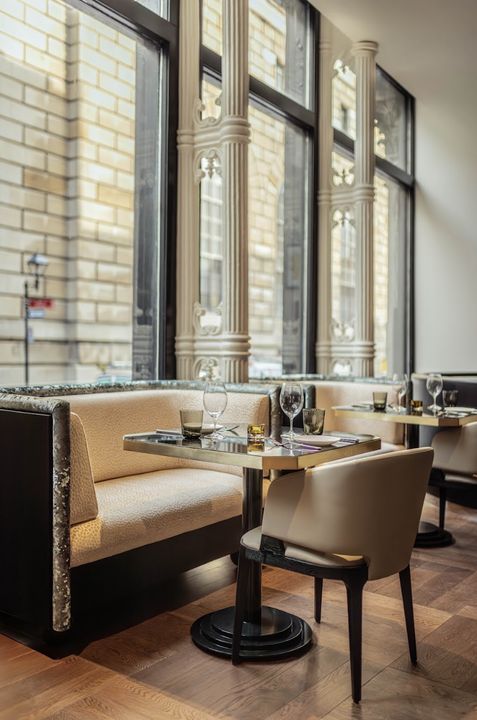 Located in Old Montreal at the intersection of Notre-Dame Ouest and Sainte-Hélène, the space is stunning. Drawing inspiration from the vibrant elegance of the 1980s, the modern décor was created in collaboration with David Dayan, Jason Lamarre, and Ivy Studio. The 90-seat restaurant features wood paneling, travertine, marble, mirrors, and clean lines, along with impressive light fixtures, evoking influences from London and Paris.