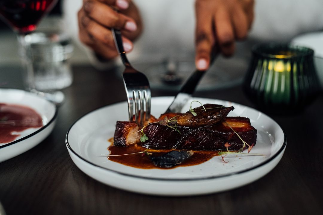On the culinary side, the menu shifts gently with the seasons, featuring weekly specials while staying true to French inspiration. Traditional dishes are revisited using local ingredients and a contemporary approach. Highlights include the celery root with bordelaise sauce—rich and refined—and the 20-hour slow-cooked pork belly with roasted onions and jus, a generous plate that lets the ingredients shine without unnecessary frills.
