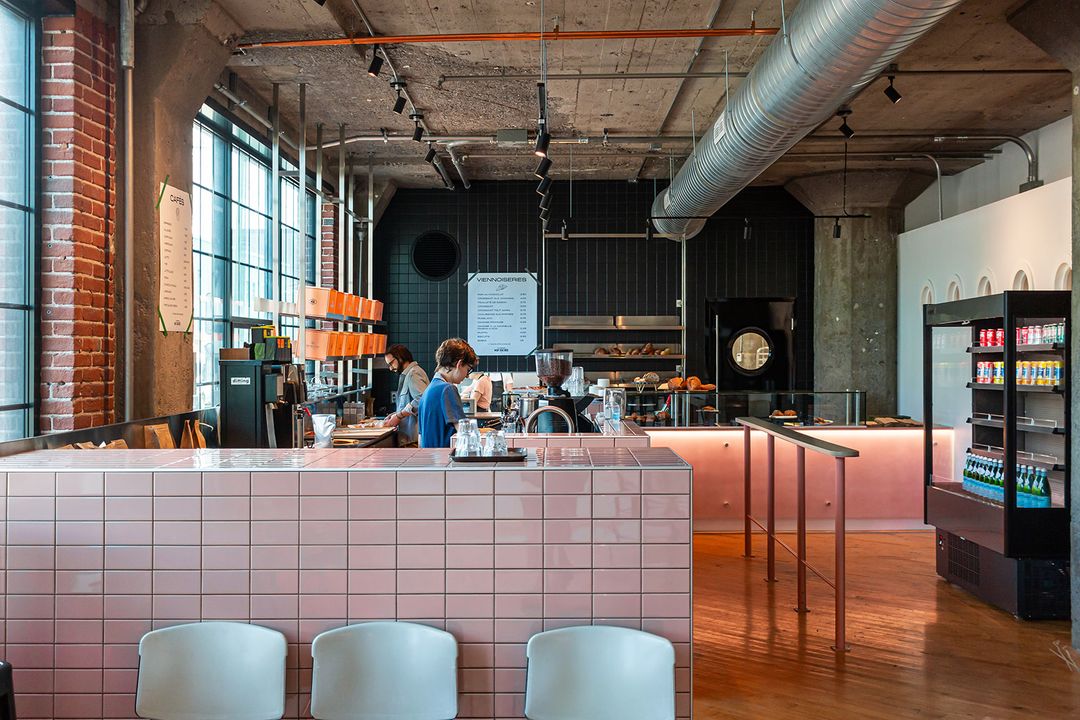 The faded pink ceramics add a touch of softness to the industrial architecture of the space, with its high concrete ceilings and large windows. The iconic orange boxes of the bakery are lined up behind the counter, where one can order the delicious viennoiseries made on site or some loaves and baguettes, which are still baked on Saint-Laurent Boulevard.