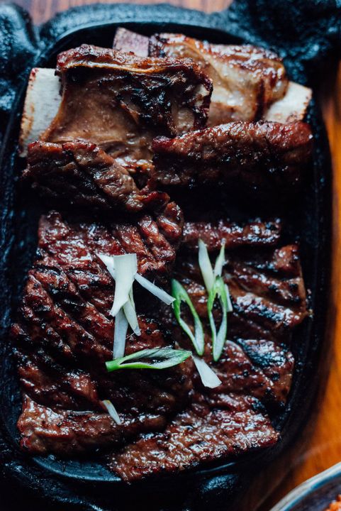 The menu features a variety of Korean dishes and restaurant specialties. Galbi (delicious beef ribs), Kimchi Jjiage (kimchi soup), Haemul Pajeon (chive and seafood pancake), and one of the best bibimbaps in town.