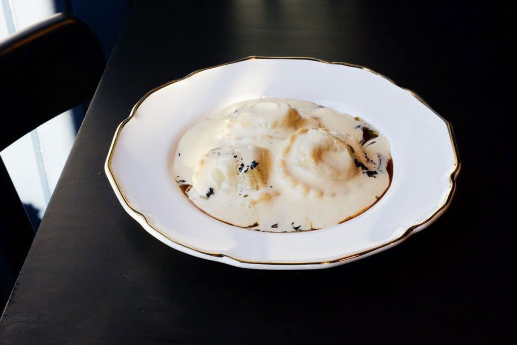 Once the space had been redesigned by architect Alain Carle, the new Île Flottante opened in late 2017. The decor has a marine look with light-coloured hardwood «deck» flooring and walls painted navy blue. The dark tables and chairs are a simple addition and don’t disturb the elegant and contemporary space. The paintings of modern art on the walls add colour and interest. Île Flottante’s staff is friendly and welcoming and altogether, the surroundings equal the quality of the food. It has doubled in size, with 48 seats now available, including four at the bar. The room is divided into two spaces and the kitchen is entirely glassed in, yet still allows us to admire the talents of the chef and team while they prepare the dishes.