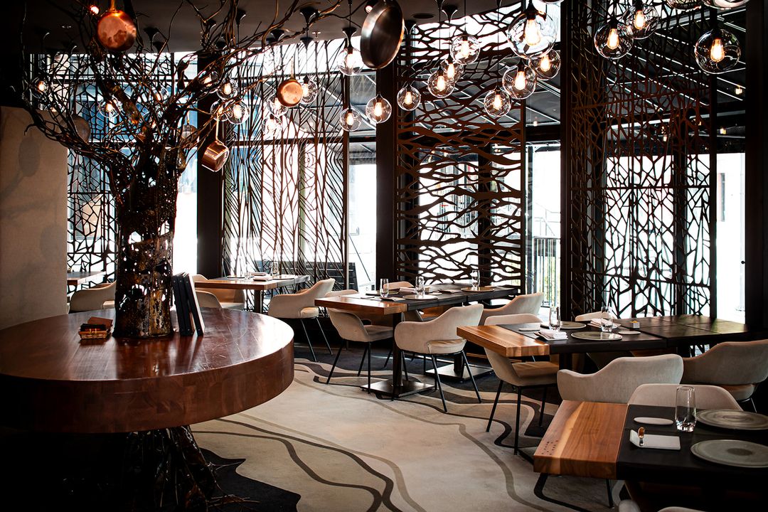 The QC interior designer Steve Girard is behind the restaurant’s decor, and he worked together with the PR firm Brad to come up with an integrated marketing approach. The huge round-shaped front façade has been fully taken advantage of, and it’s pretty difficult to miss the blue neon signage calling you into the restaurant. Inside, the unique pierced metal screens that have been mounted to provide intimacy are quite beautiful, and are the work of the artist REBELLION. The showpiece metal tree in the same space is also a creation from the same artist, and together with the other design elements from Steve Girard, there’s a sense that everything flows together well. This area can seat 35 and should you be looking for a private dining room, the one at Laurie Raphaël offers space for 15 (by reservation). Their patio is currently being used as a venue for an exhibition by Passages Insolites (see ‘le projet collectif 5’).