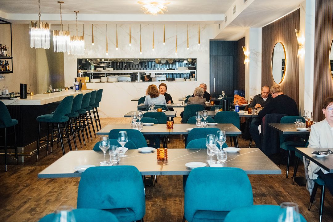 The decor is chic without being pretentious, comfortably accommodating 60 guests—whether for a family dinner, a meal with friends, or a lunch with colleagues. Particular attention has been paid to noble materials like marble, wood, and touches of teal velvet, which blend harmoniously throughout the space. The atmosphere is lively yet always warm. In summer, a front terrace seats about twenty guests.