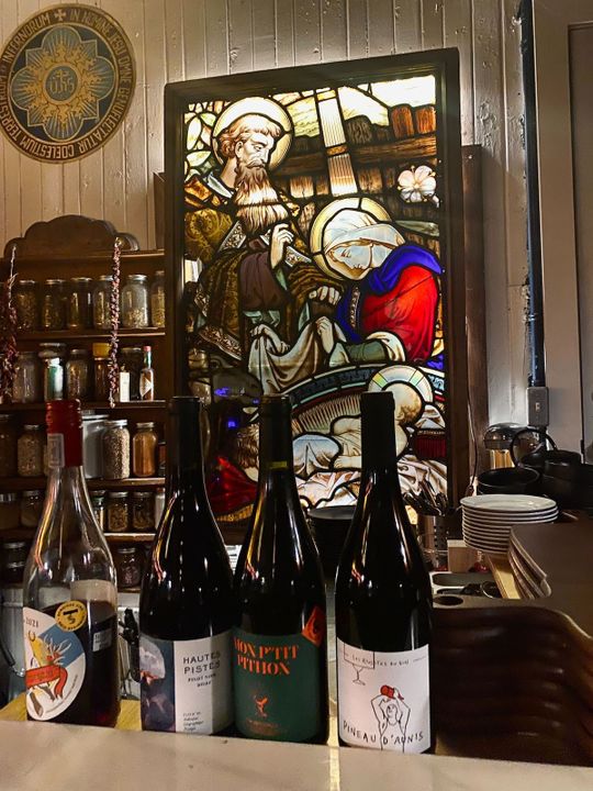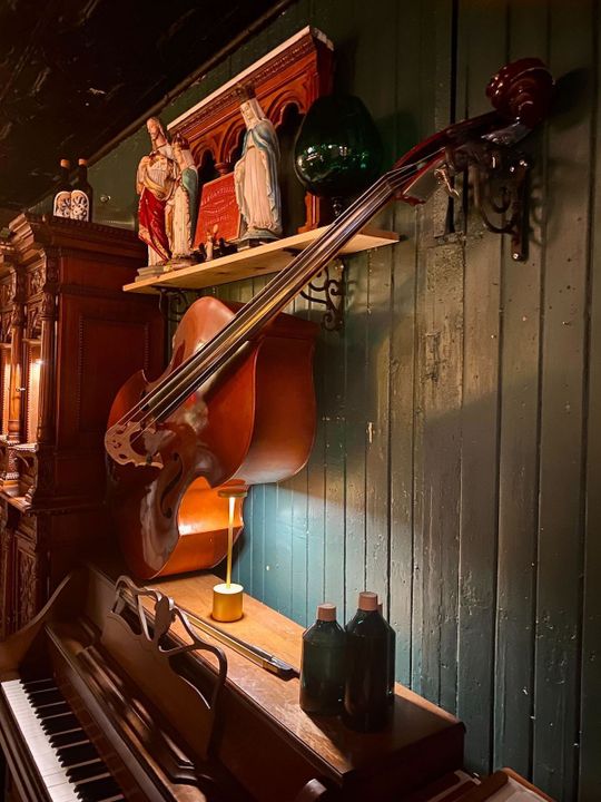 Without feeling like you’re in a church, the decor of the space takes you back to it in some ways when you pay attention to the details. Magnificent stained-glass windows, statues, and other knick-knacks make for an atmosphere that’s soft, warm and intimate. Why such a choice? “Simply because I love the aesthetics of Catholic religious art and I love to recover objects with a history that nobody wants anymore, to give them a second life.” explains Islem.