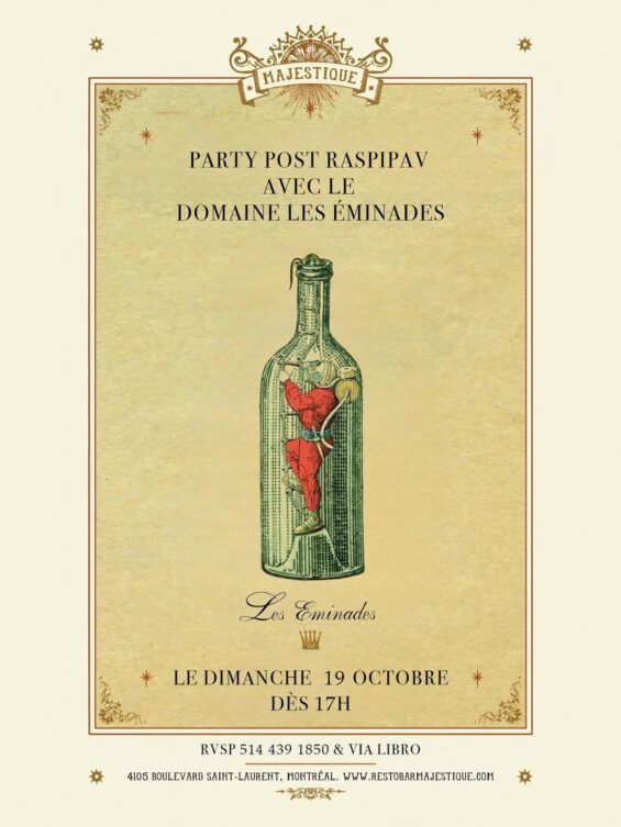 Le Majestique prolonge la fête : le Domaine Les Éminades prend le bar pour un party post-Raspipav. Au programme : verres, bouteilles et flights — de quoi explorer la gamme selon l’humeur. Ambiance conviviale, arrivages aux petits oignons : à ne pas manquer.