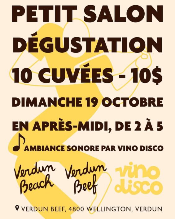 Un après-midi à la cool : 10 cuvées à découvrir pour 10 $, ambiance musicale signée Vino Disco, bouchées et bonnes vibes au comptoir. On passe, on goûte, on jase — simple et convivial. Où? 4800, rue Wellington, Verdun.