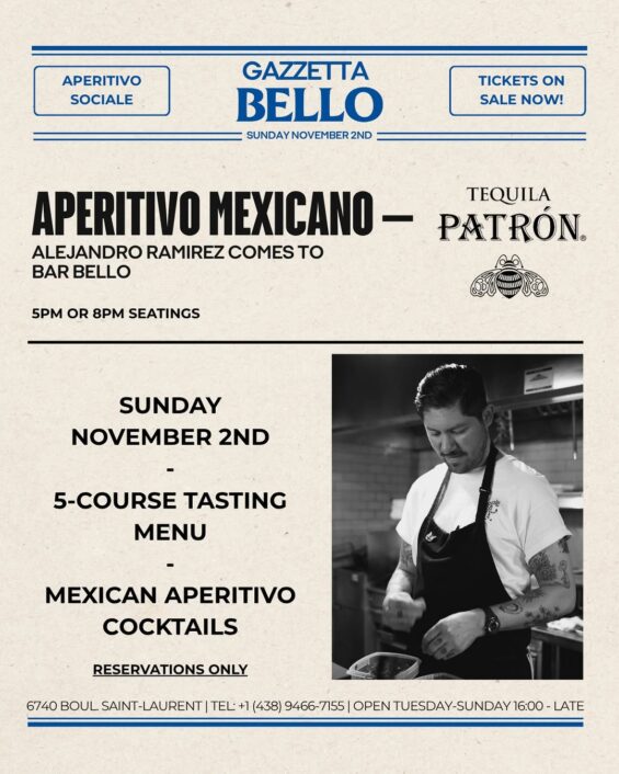 Le dimanche 2 novembre, Bar Bello reçoit le chef Alejandro Ramírez Huerta (Guadalajara; expériences en cuisine au Mexique, en France, au Canada et en Espagne) pour un menu en 5 services — une soirée unique, ambiance Mexique du trottoir au comptoir. Au programme : classiques de street food revisités, cocktails “aperitivo” à la mexicaine, et une trame sonore entre banda, ranchera et cumbia. En option, dégustation de Gran Patrón Burdeos. Places limitées!