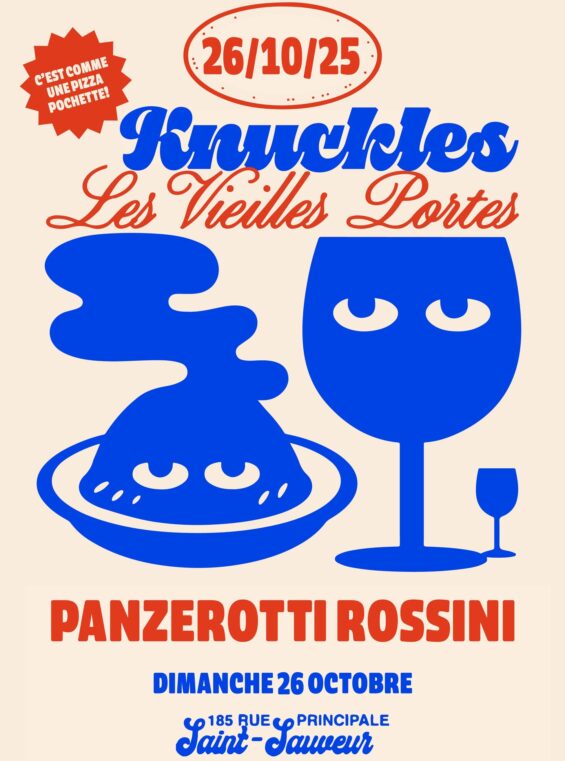 Le temps d’une soirée, Knuckles pose ses valises aux Vieilles Portes pour une soirée d’exception : panzerotto “Rossini” garni de steak, foie gras et truffe. Des panzerotti classiques végés seront aussi de la partie, et le menu habituel des Vieilles Portes demeure disponible. Places limitées : réservation fortement recommandée.